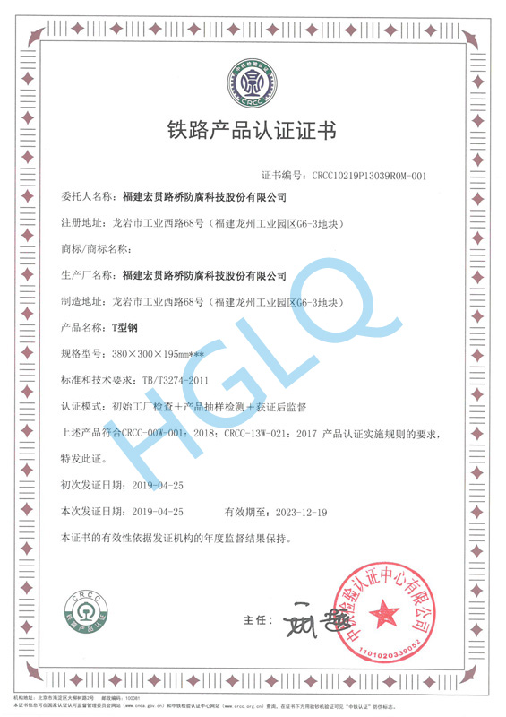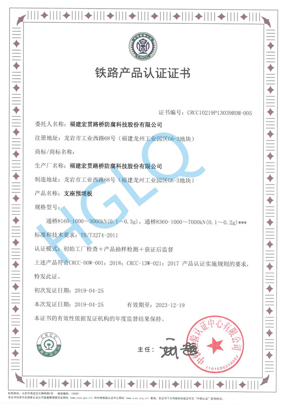 支座預(yù)埋件鐵路產(chǎn)品認(rèn)證證書(shū)
