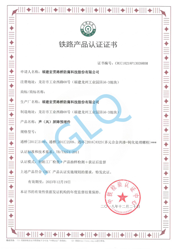 聲(風(fēng))屏障預(yù)埋件鐵路產(chǎn)品認(rèn)證證書