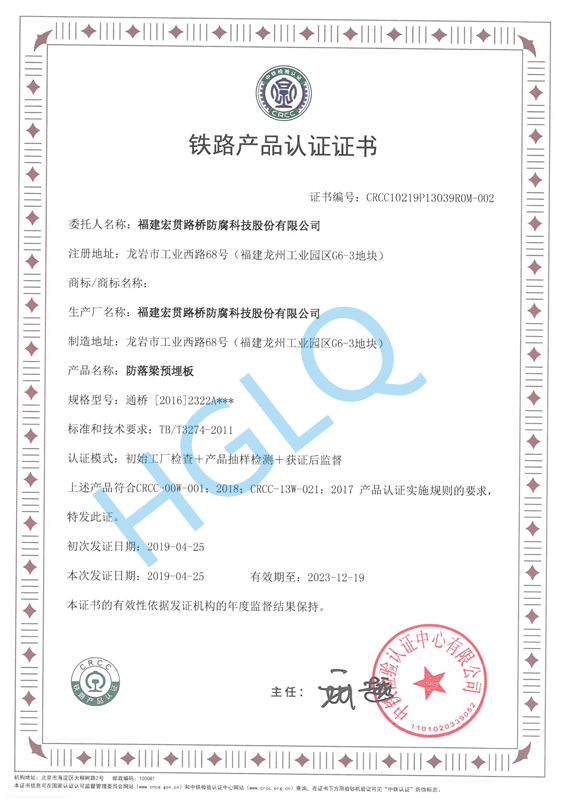 防落梁預(yù)埋板鐵路產(chǎn)品認(rèn)證證書